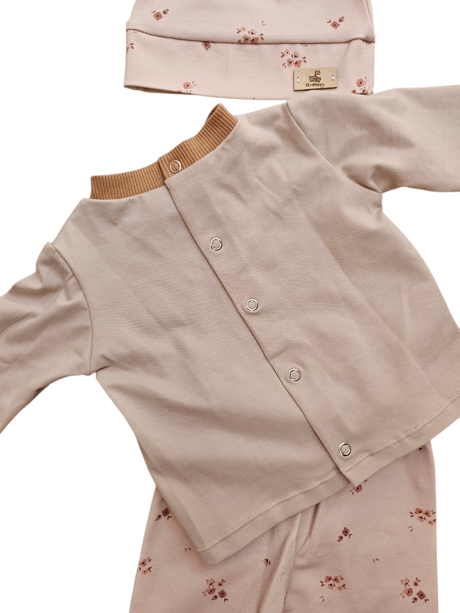 Conjunto new born con estampado de mini flores sobre fondo capuchino