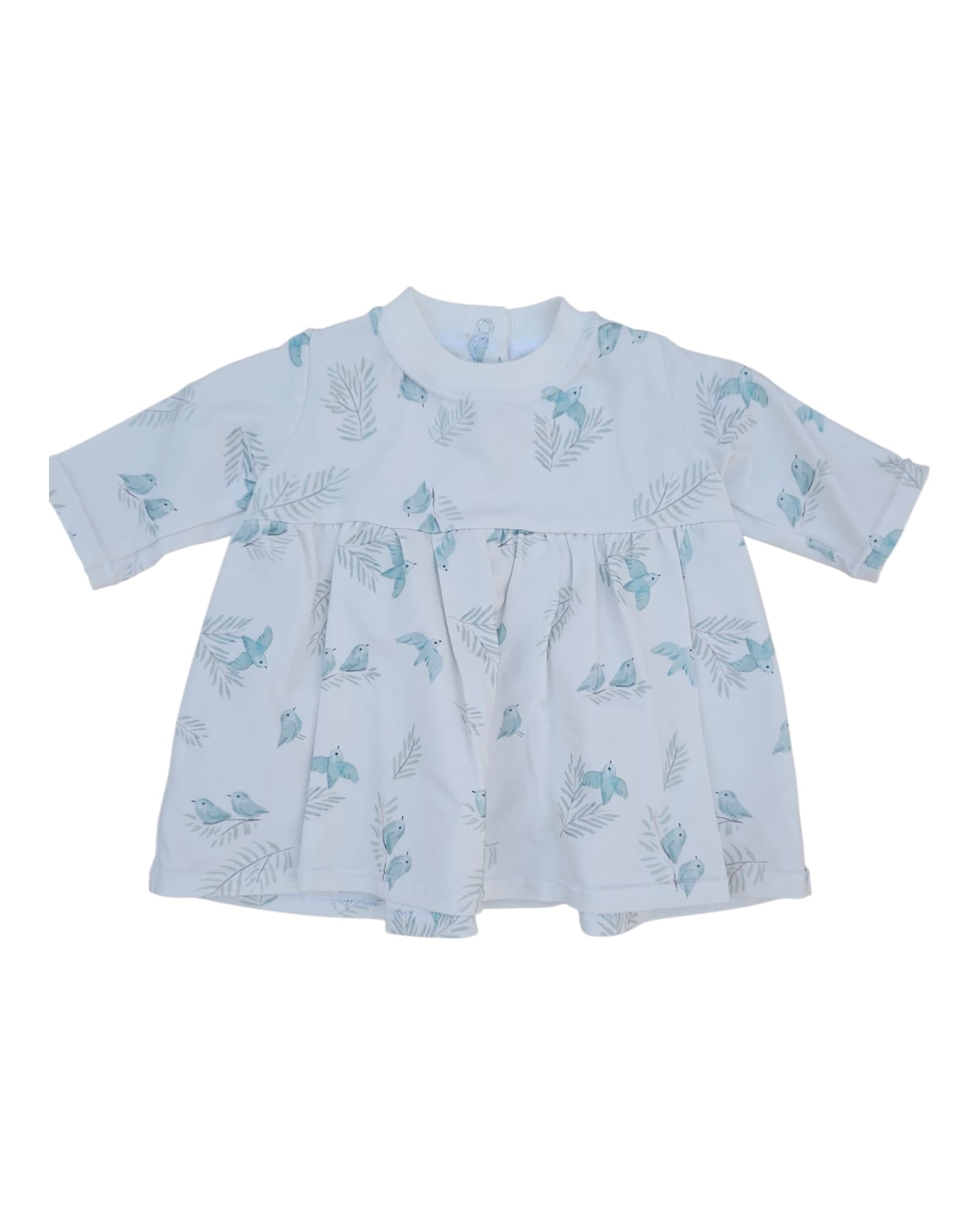 Vestido manga larga de jersey con estampado de pequeños pajaritos en turquesa sobre fondo blanco roto.