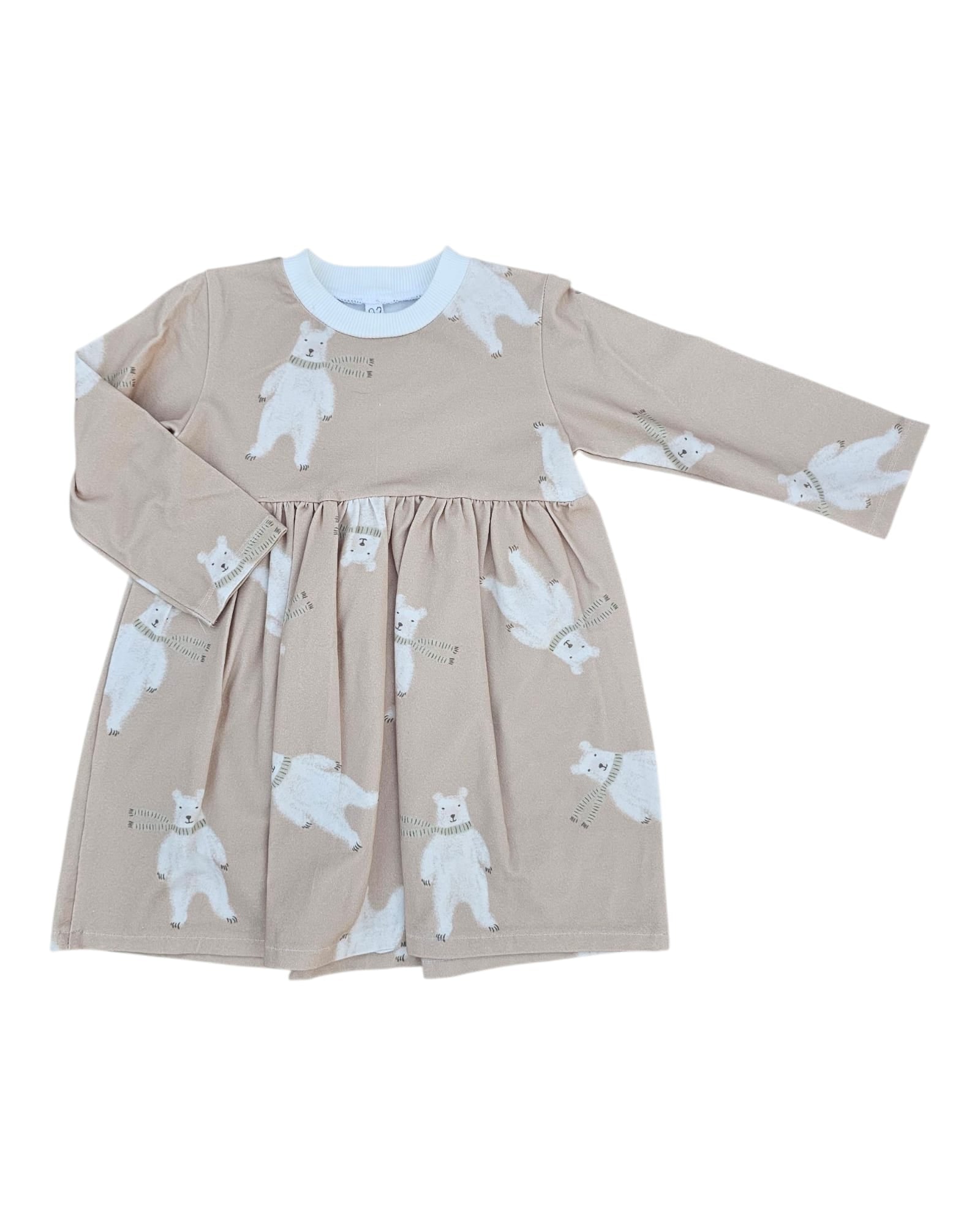 Vestido manga larga de jersey con estampado de osos bien abrigados sobre fondo marrón claro