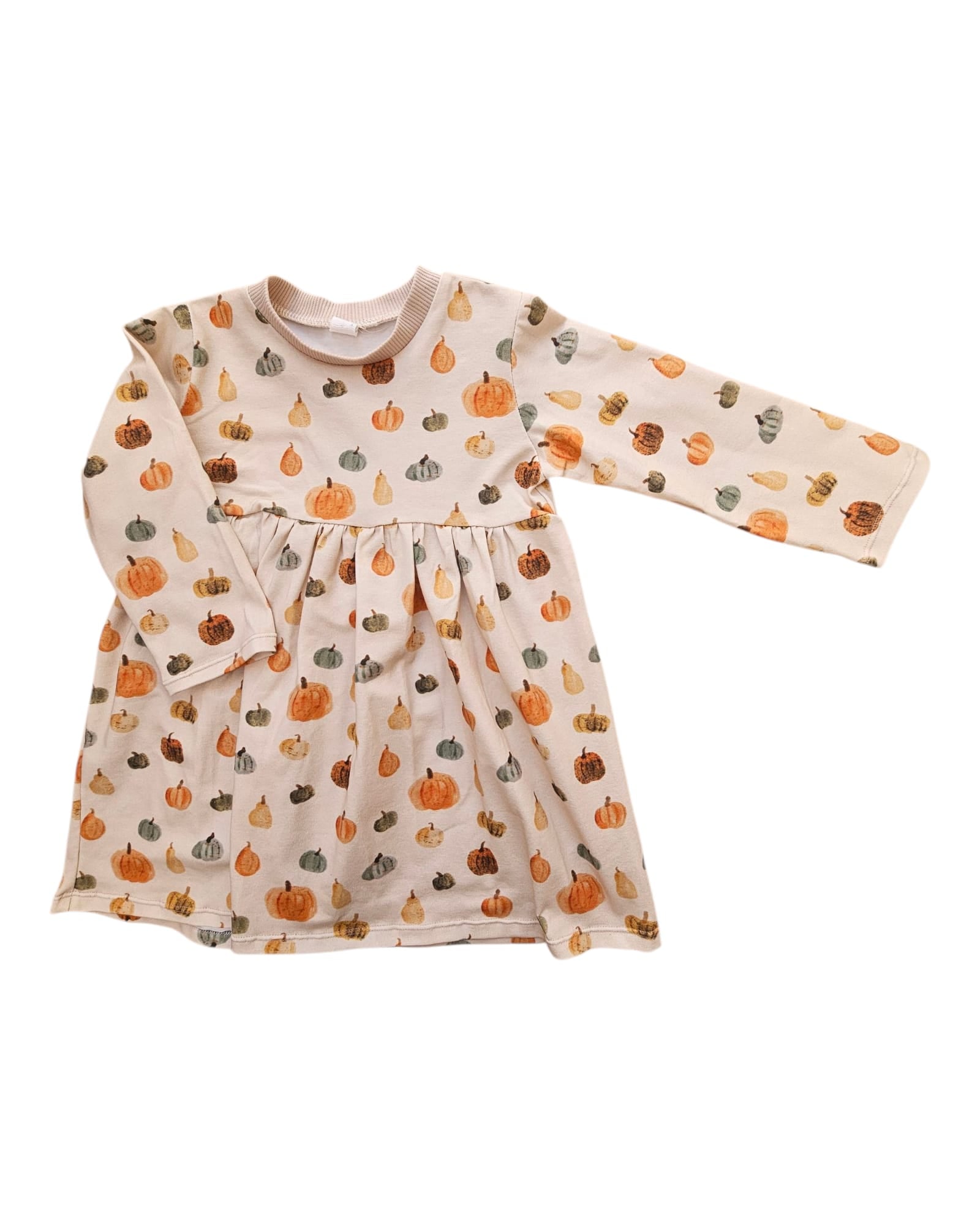 Vestido manga larga de jersey con estampado de calabazas de colores sobre color crema.